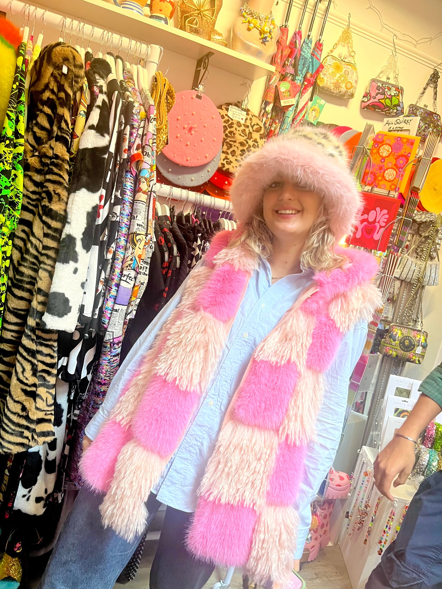 Wrap yourself in cosy luxury with our Handmade Bamboo Faux Fur Check Gilet in Pink. Designed in a chic oversized fit, this one-size statement piece features a soft pink contrast faux fur check pattern, blending bold style with ultimate comfort. Made from a premium mix of Tencel, Bamboo Lyocell, and Modacrylic, it's as breathable and sustainable as it is irresistibly soft.