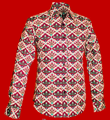 Flowers in the Tile Design long sleeved Retro 70s style shirt in creme-Red-Black
