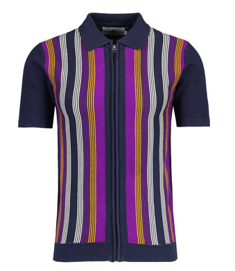 Madcap Capitol 60s Mod Stripe Knit Zip Polo Shirt in Navy Blazer