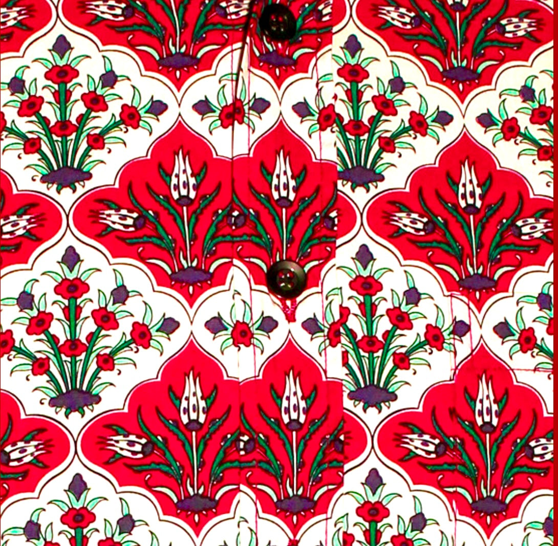 Flowers in the Tile Design long sleeved Retro 70s style shirt in creme-Red-Black